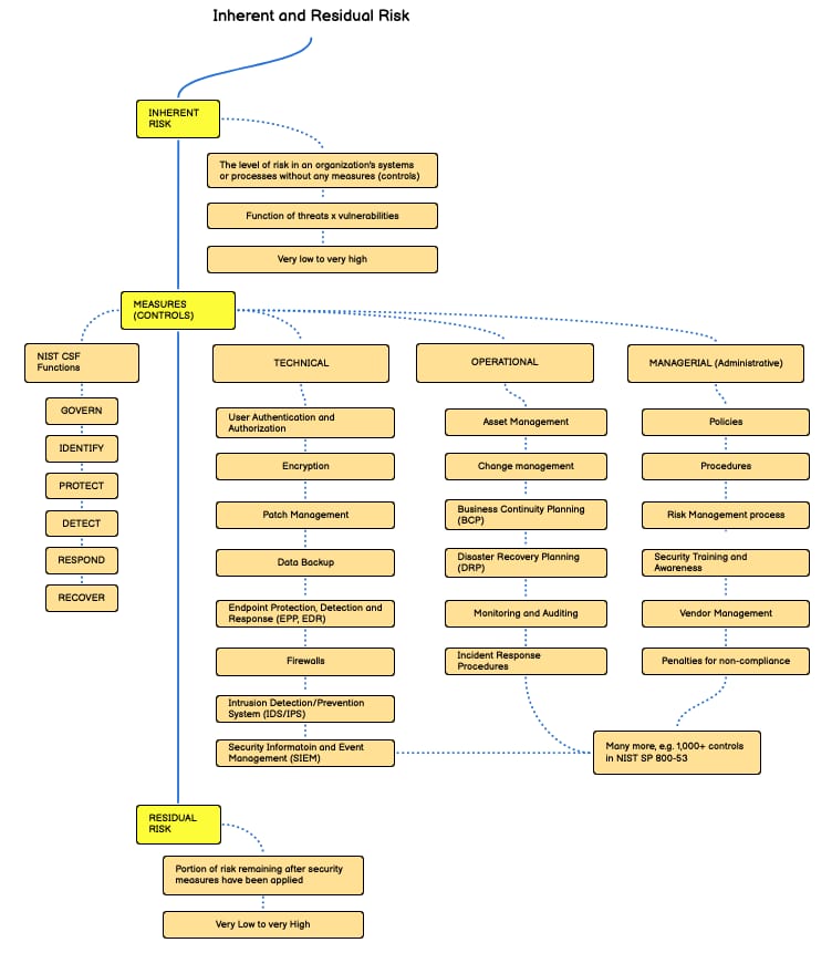 Residual Risk | The level of risk that remains after implementing risk mitigation measures | The “bottom line,” current state risk level |