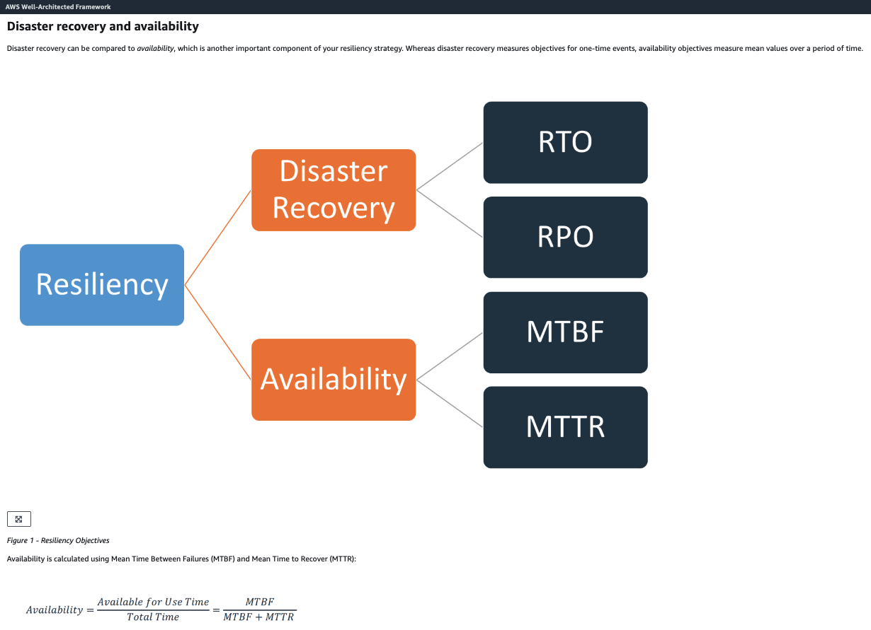 Mean Time to Recover (MTTR) | The average time required to restore a failed system or process to full functionality after an incident | The AWS whitepaper below notes that while RPO and RTP measure objectives for one-time events, MTTR and MTBF measure mean values over a period of time |