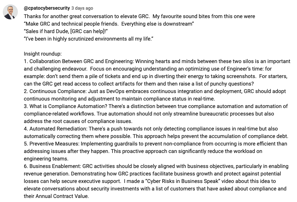 The conversation highlighted the distinction between automating compliance workflows and true compliance automation.