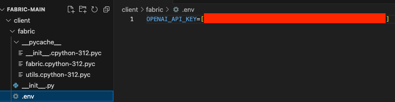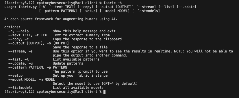 echo 'alias fabric="python3 /Users/cpatocybersecurity/VSCode/fabric-main/client/fabric/fabric.py"' >> ~/.zshrcalias fabric="python3 /Users/cpatocybersecurity/VSCode/fabric-main/client/fabric/fabric.py"9.1 Activate the virtual environment