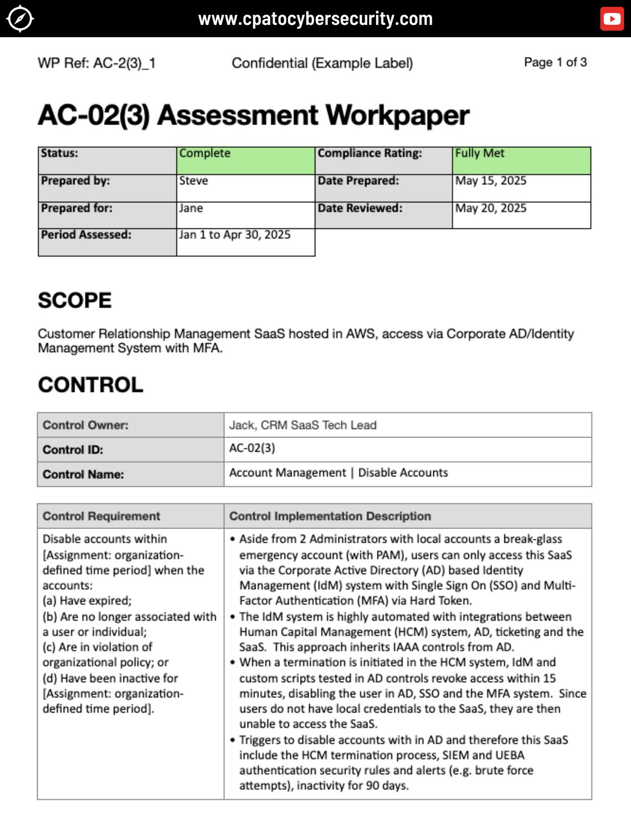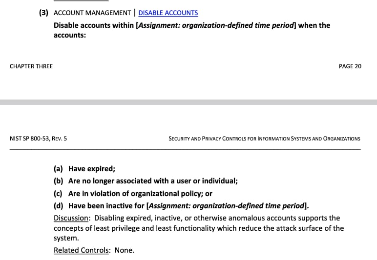 Note that the control requirement is from the “control dictionary” NIST SP800-53, for which this fictional company has written an Implementation Description for their environment.