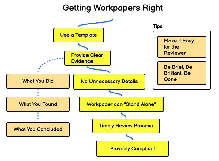 It’s important to get workpapers right since they’re reviewed by your manager, Quality Assurance teams and potentially other groups looking to meet deadlines and have a solid basis for compliance attestations. They want you to include clear evidence of three things: